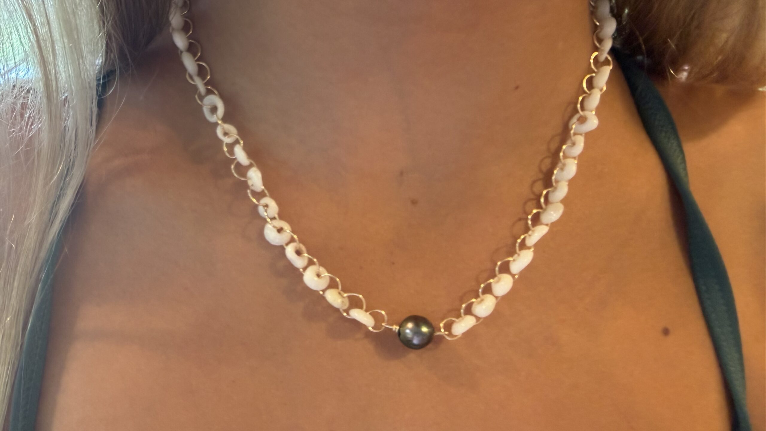 This one-of-a-kind piece features a whole, natural puka shell handpicked from Hawaii’s shores, paired with a lustrous Tahitian pearl that captures the depth and mystery of the ocean. Each shell and pearl are framed with U.S. gold-filled accents and strung in our signature no-chain infinity loop design, symbolizing wholeness, balance, and endless connection to the sea.